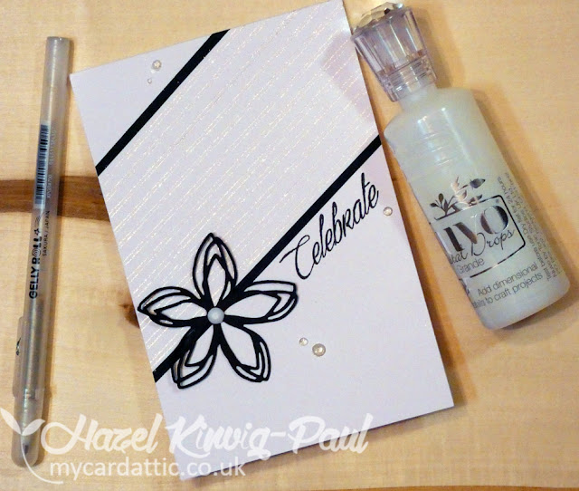 So, I drew some lines on the diagonal with it, bordered it top and bottom with two small strips of black card-stock, added a die-cut flower, a sentiment and a white gem in the centre of the flower.